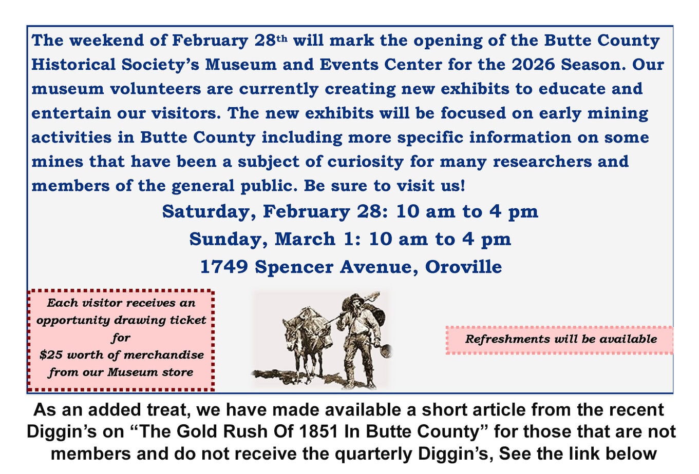 Our inhouse archives have grown considerably since 1956. We will be adding interesting historical presentations and developing our online research capabilities. The History tab has interesting bits of history for your enjoyment. On the Researchers tab, we will present excerpts from the archives online, photos, documents, maps, newspaper articles and some family histories. Although impossible to place all the material in our archives online, over time we will continue to grow the researchers offerings. We have a dedicated staff to help you with your research, both inhouse and online. We added a Bookstore to our webpage where you can purchase various information on local history online. We hope these new changes will help the community appreciate our magnificent history and those researching their family’s history to better understand where their ancestors lived. If you are in our area, Butte County, California, stop by one of our five facilities. The BCHS Museum offers a lot to see and has a vast collection of books for sale. The Archives, adjacent the Museum, has a vast collection of photos, documents, maps and other interesting information to help the researcher. The Ehmann Home, Bangor Church and Oregon City School are a delightful step back in time. Click the individual photos on the main page for more information and history on all our sites. We hope you enjoy our new look and please check back as we add additional information.
